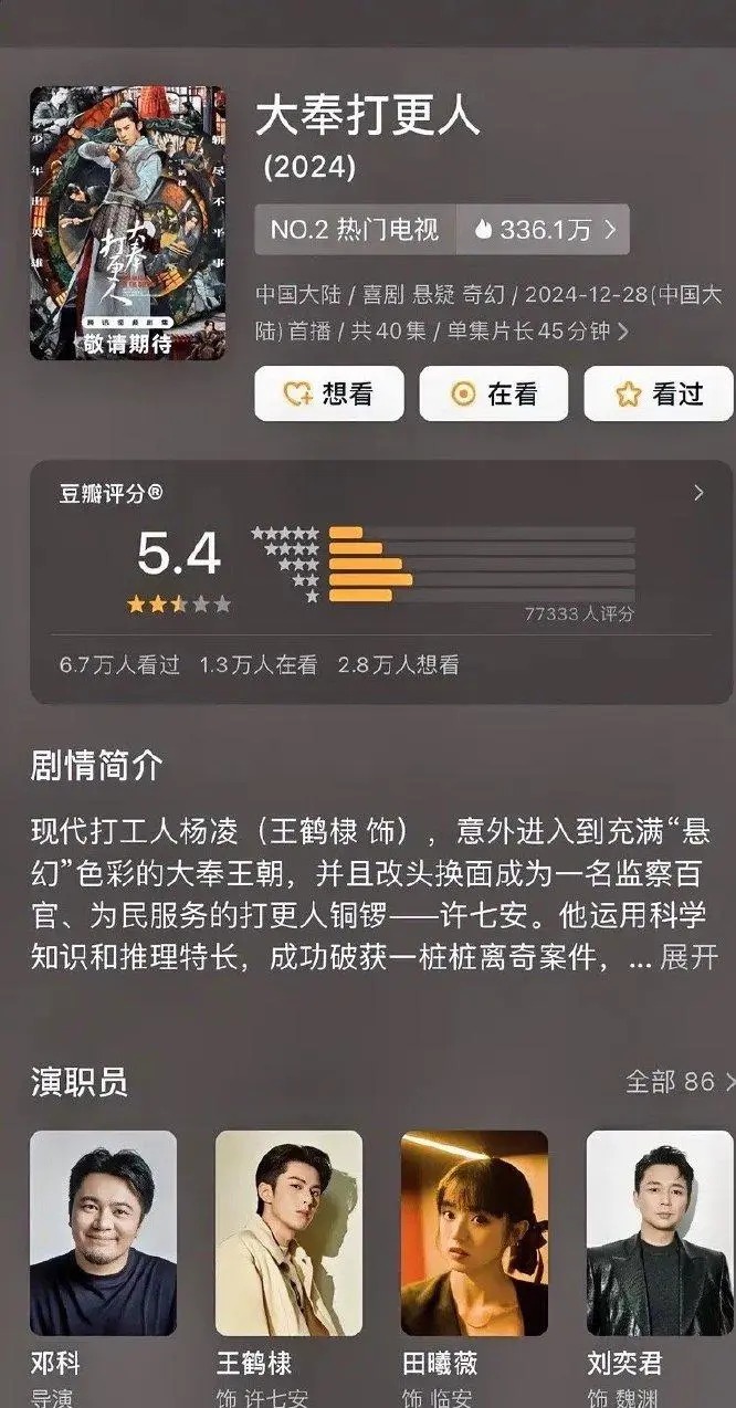 率先开播的跨年大剧《大奉打更人》,开播前有多高调,各方宣传的预制爆剧,播出后打脸就有多疼。作为一部改编自热门网络小说的古装悬疑剧,《大奉打更人》自开拍以来便备受期待。王鹤棣又凭借其近年来在多部热门剧集中的出色表现,成功吸引了大量粉丝的关注。一开播漫天差评涌来,不满意王鹤棣演许七安的选角,吐槽演技吐槽口音,还吐槽剧情改编,部分观众对角色塑造、剧情逻辑以及服化道等方面提出了不少质疑,让这部剧开局不利。