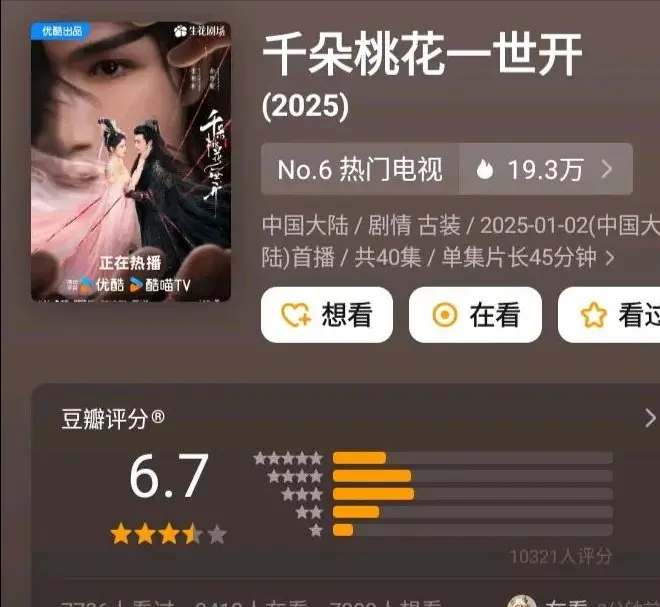 《千朵桃花一世开》开分6.7分,虽然在口碑上高于前2部剧,但这部剧热度相当低。这也是一部仙侠剧,改编自随宇而安的同名小说,由张彬彬与孙珍妮主演,讲述了一段跨越三生三世的甜宠虐恋故事。