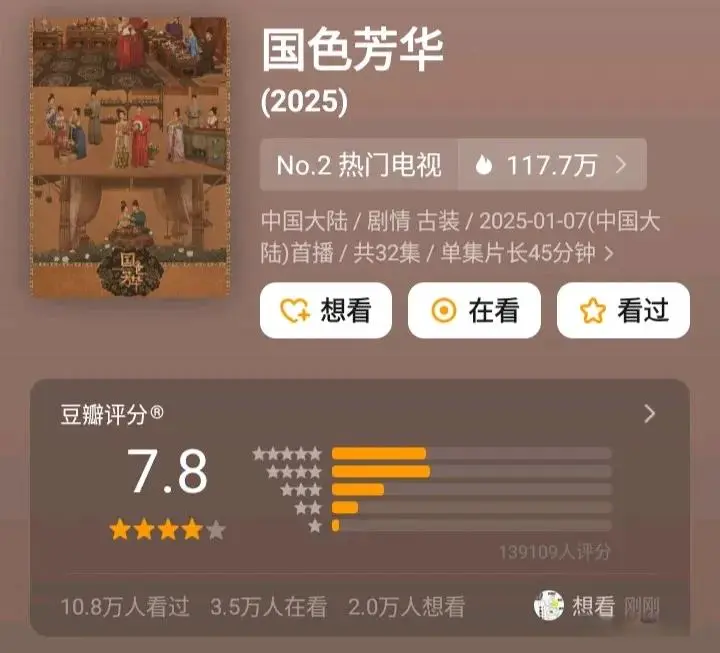 杨紫和李现主演的《国色芳华》上线以来,便以其独特的魅力迅速吸引了大量观众的眼球。开播十日,超17万人参与评分,斩获了7.8的高分,近期新剧排名稳居第1。而且2024年豆瓣评分最高华语剧集榜单前10名中,第10位是7.9分的《边水往事》,这部剧还在播放中,不出意外的话,后期还会增加,有可能进入高分剧集榜单中。